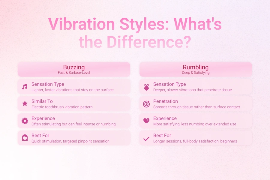 - Rumbling vibrations are deeper and slower, spreading through tissue rather than sitting on the surface. Many people find them more satisfying and less numbing over time.