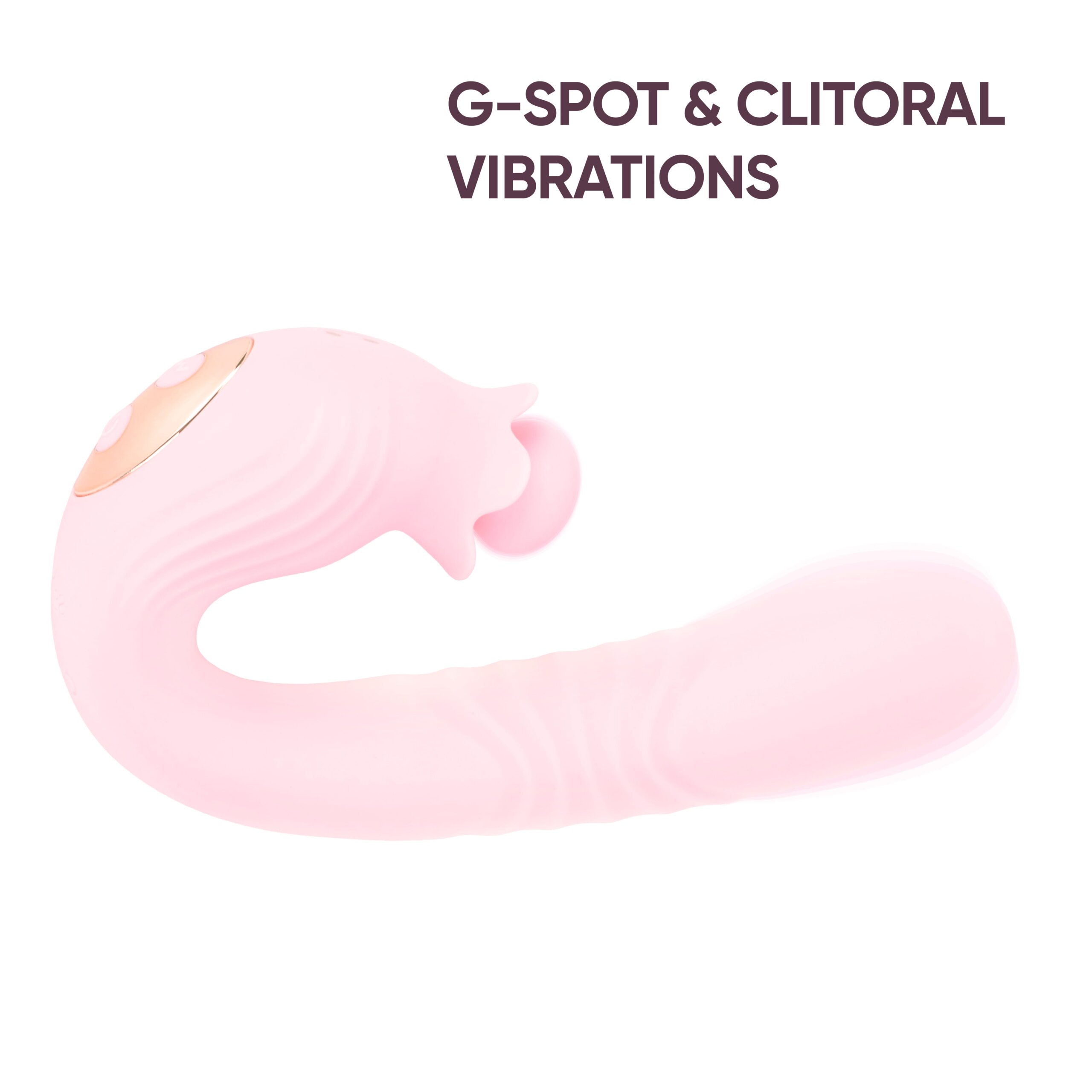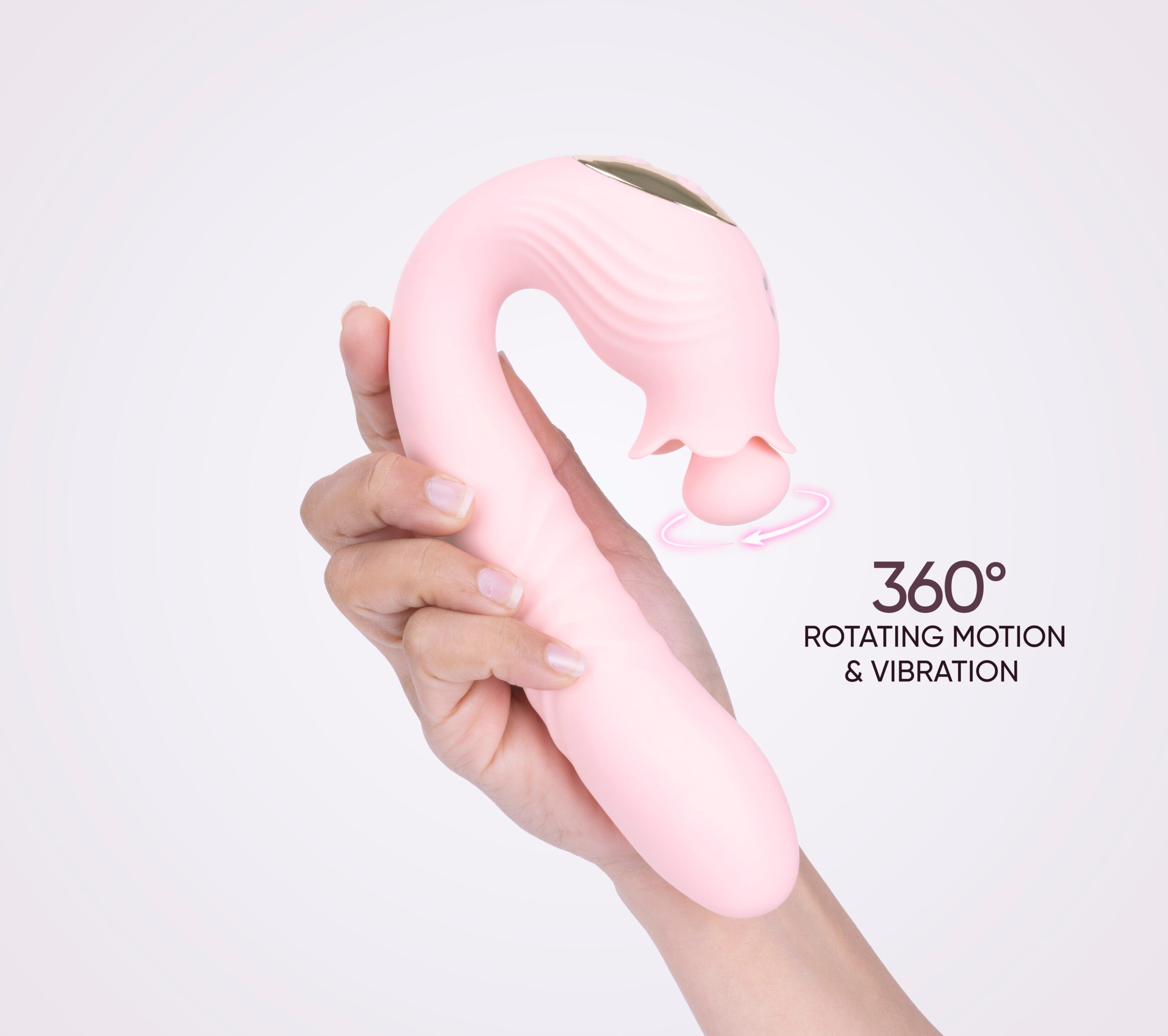 Rhythmic thrusting pairs with deep internal vibration while the rotating clitoral stimulator delivers continuous external pleasure, creating a harmonious blend of motion, vibration, and beautifully balanced sensation.